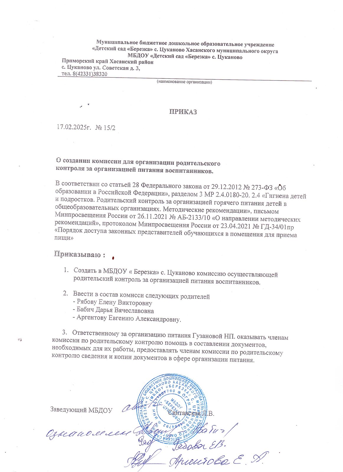 По всем вопросам организации питания в МБДОУ "Детский сад"Березка" с.Цуканово вы можете обратиться к заведующему Свитавской Любови Владимировне. по телефону: 84233138320 или в приемные дни с понедельника по пятницу с 15:00 до 16:00ч, через электронную почту svitavskaya.lyubov2014@yandex.ru